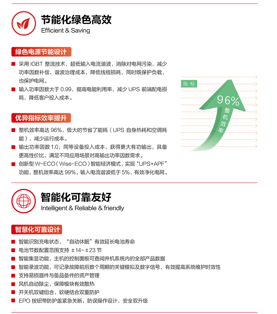 零件效力高达96%,极大的节流了能耗(UPS 本身热耗和空调耗能),削减运转本钱。